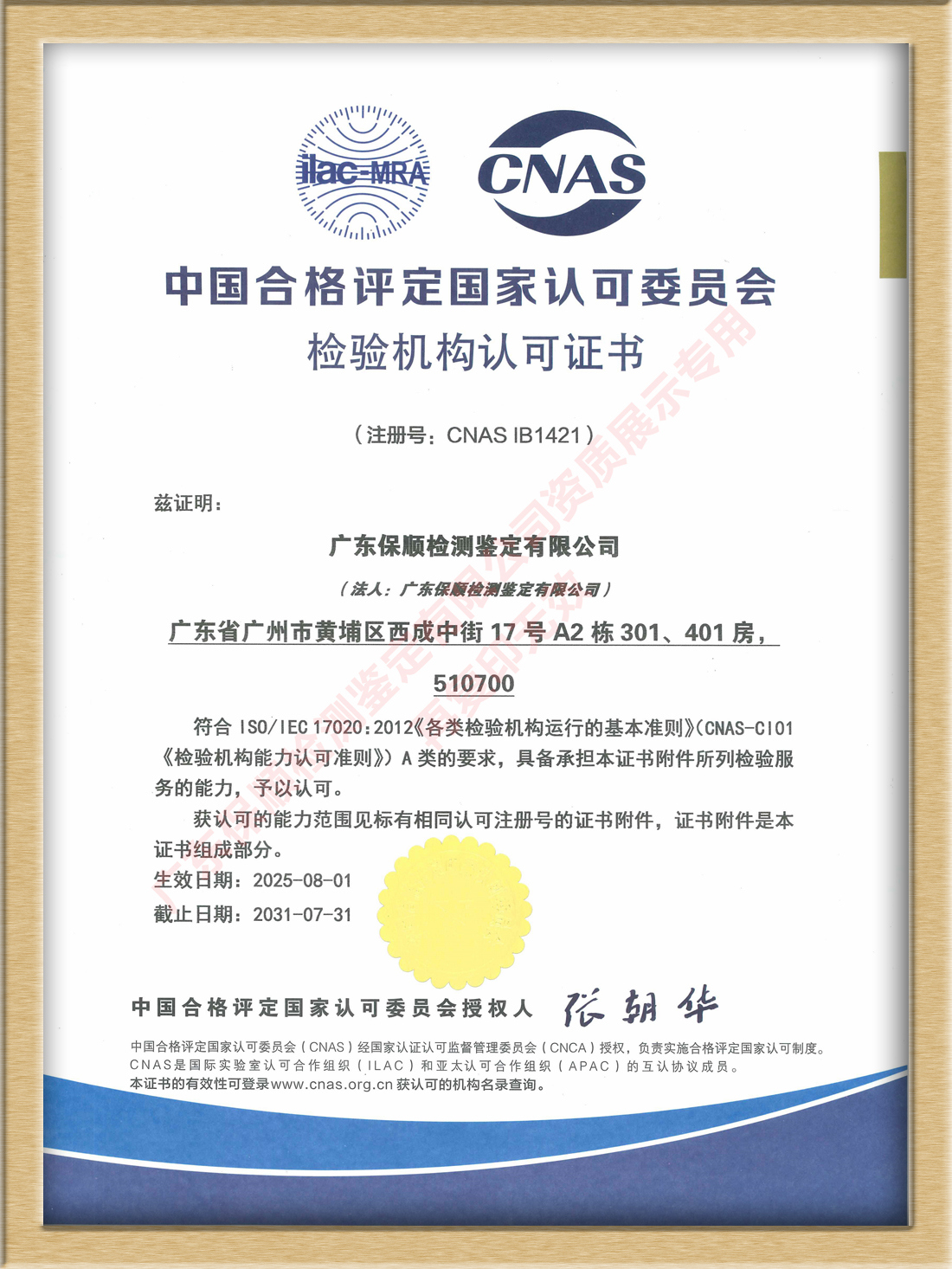 中國合格評定國家認可委員會CNAS檢驗機構認可證書